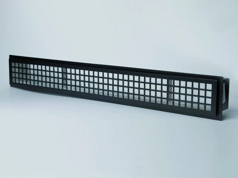 CB-tec Design-Luftleiste Kamin Ofen Luftleiste 550 mm schwarz, quadratischer Auslass, dzs55s – Designluftleiste schmal bestehend aus Einbaurahmen und herausnehmbarem Gitter mit quadratischen Auslässen.
