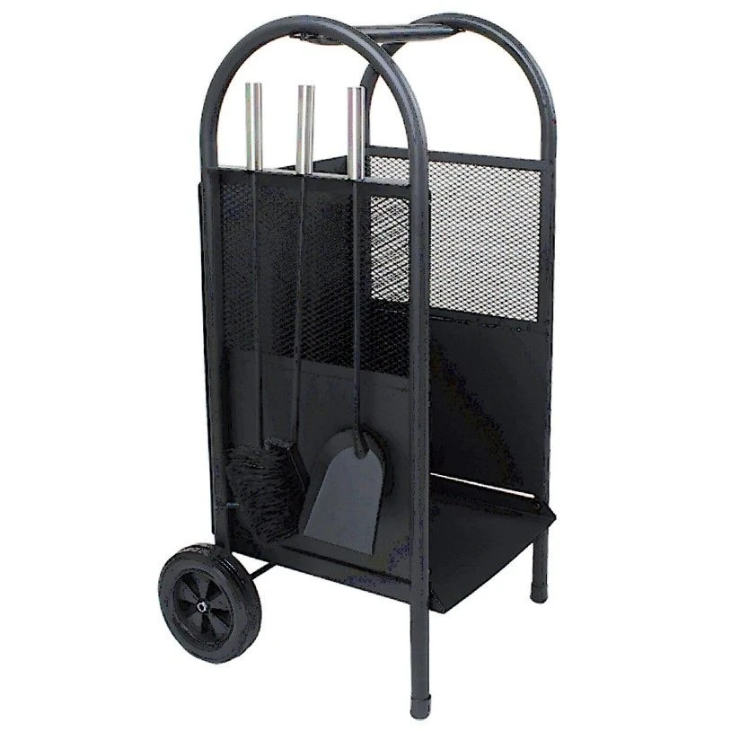 verfügt sowohl über zwei Standfüße vorne wie auch 2 Rollen hinten. Der Wagen und das 3-teilige Kaminbesteck sind schwarz beschichtet und das Besteck besitzt Griffe aus Edelstahl.