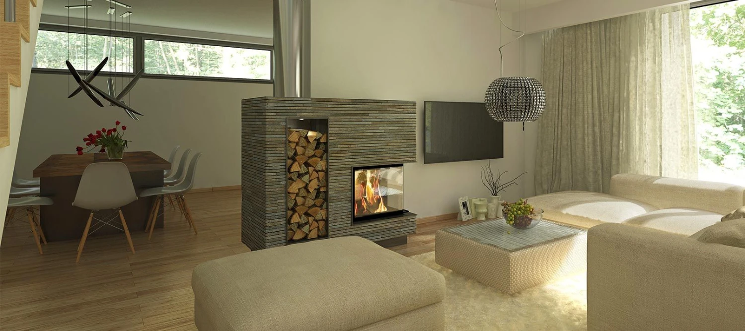 Mehrfache Feuersicht – durch die eckige Front und die abgewinkelte Scheibe erhält man eine 2-fache Sicht auf das Flammenspiel – mit dem Kamineinsatz Ekko 55.