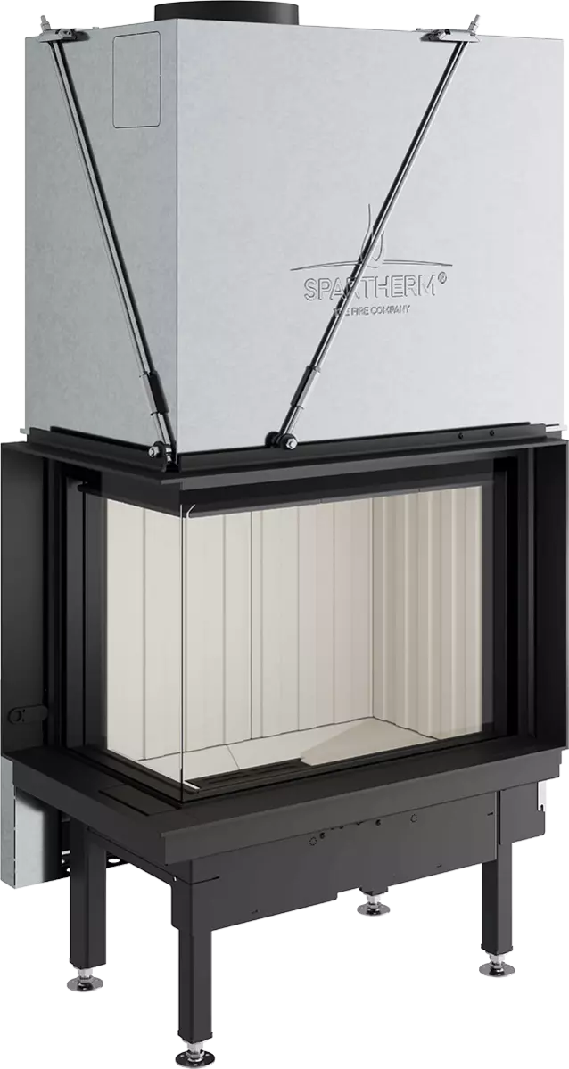 Spartherm Kamineinsatz raumluftabhängig, L-Scheibenform, Nennwärmeleistung 9,6 kW. Möglichkeit separate Verbrennungsluft anzuschließen, erfüllt die 2. Stufe der 1. BImSchV, sowie Artikel 15a B-VG 2015. Korpus aus 3,0 mm Spezialstahl.