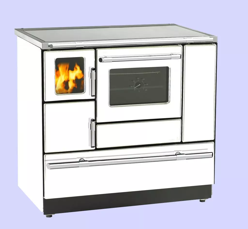 Vollherd im klassischem Design mit Sichtfenster fürs Feuer. Der 90 cm Holzherd in pflegeleichter Emallie lackiert mit massivem Edelstahlrahmen sowie geschliffener Stahlplatte (auch in Ceran Lieferbar ohne Anschlussmöglichkeit nach Oben!) verfügt über ein Großraumbratrohr mit Temperaturanzeige und einem geräumigen Brennraum.