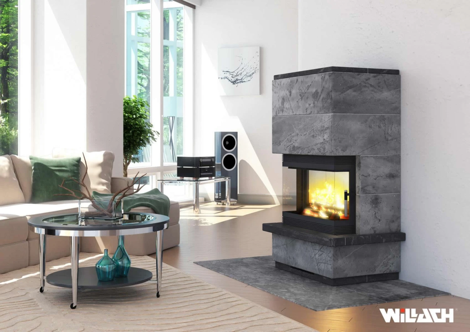 Der Willach Kaminbausatz Wega Speckstein Speicherkamin – ein effizienter Speckstein-Kaminofen mit einer zugleich riesigen U-Form-Panoramaglasscheibe. Knisterndes Feuer aus jeder Perspektive.